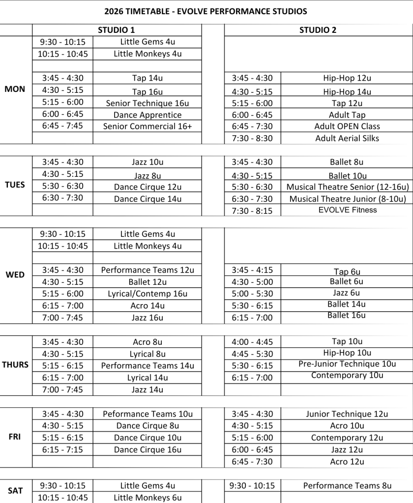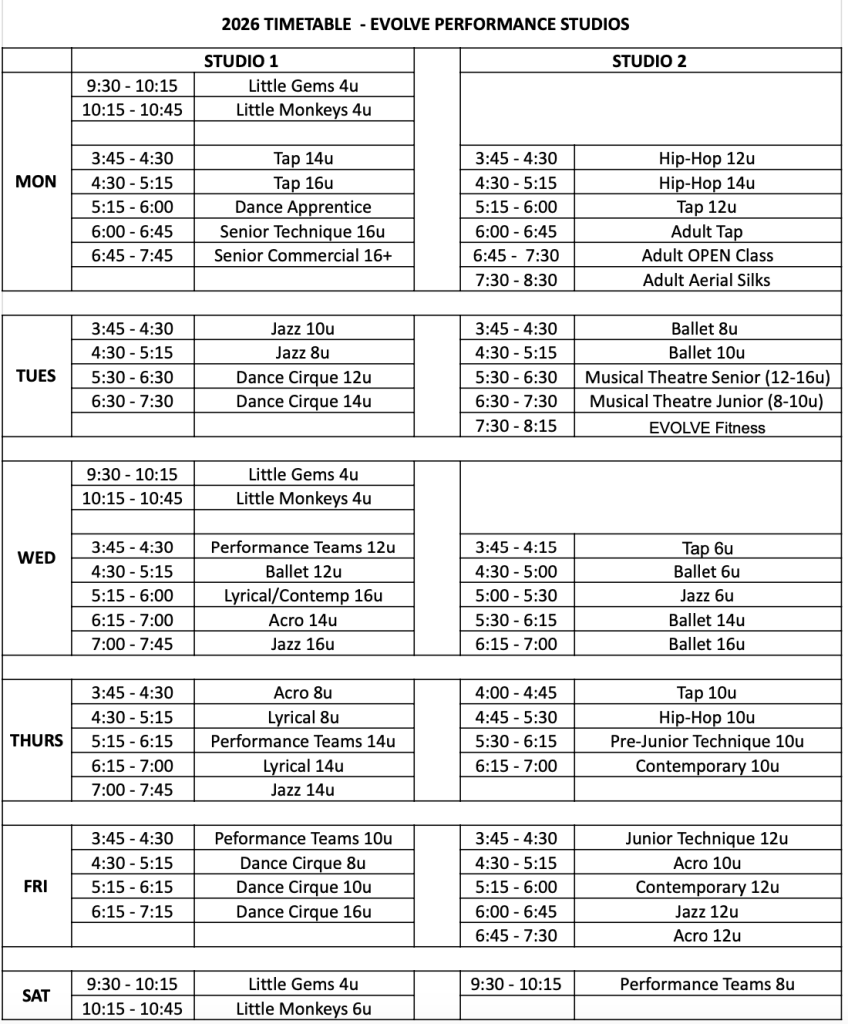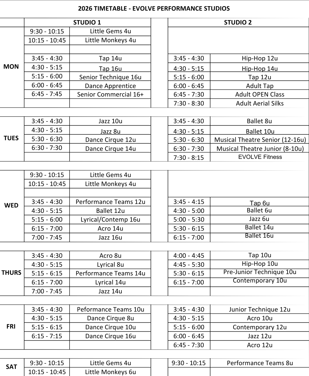 If a student misses a class, they must provide 24 hours notice via phone, text or email in order to receive a make-up lesson. Once a student has enrolled for a Term, they are committed to their lessons each week. EVOLVE PERFORMANCE STUDIOS does not accept responsibility for any loss of finances due to sickness or injuries.